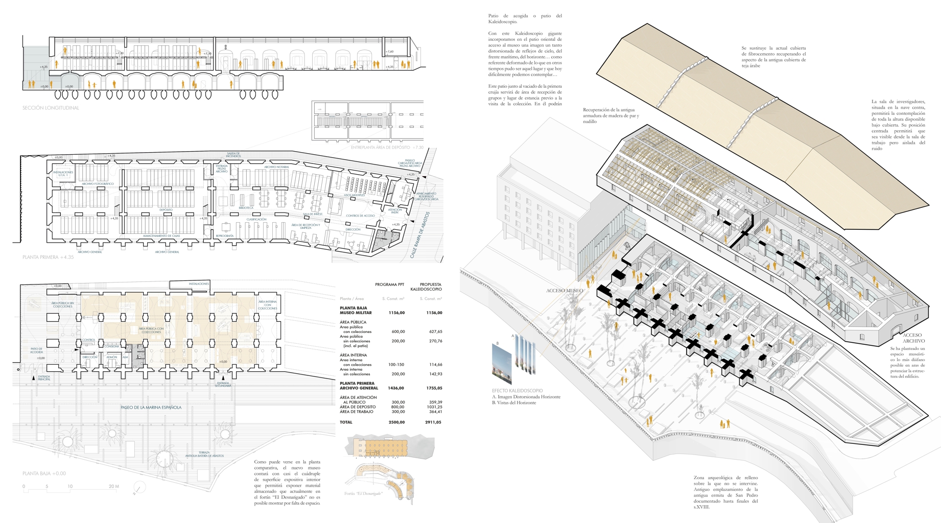 Bajo el nombre de Kaleidoscopio (del griego kalós: bella, éidos: imagen y scopéo: observar), lapropuesta de Buró4, Gabriel Verd y Pablo Millán se centra en recuperar para el nuevo Museo la imagen que antaño sirvió de marco al Almacén de Abastos, es decir, la de un entorno desprovisto de obstáculos de fortificaciones que se alzaban a lo largo de la actual calle Compañía del Mar y del frente marítimo norte de la Almina de Ceuta.